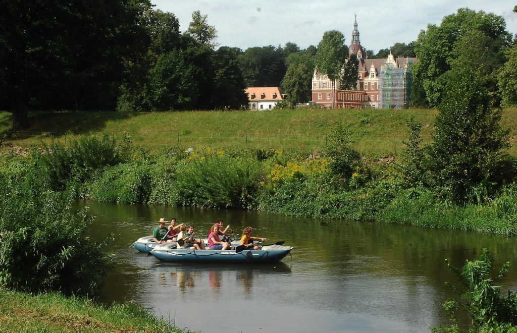Die Bootstouren rund um Bad Muskau gehören zu den landschaftlich eindrucksvollsten Strecken auf der Neiße. Zwischen sanften Flussbiegungen, alten Baumalleen und weitläufigen Wiesen eröffnet sich eine Kulisse, die Natur und Kultur auf besondere Weise verbindet. Ein echtes Highlight: der Blick auf das UNESCO-Welterbe Schloss Bad Muskau, das sich vom Wasser aus von einer ganz neuen Seite zeigt.